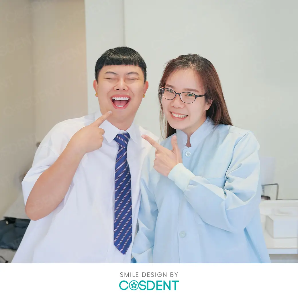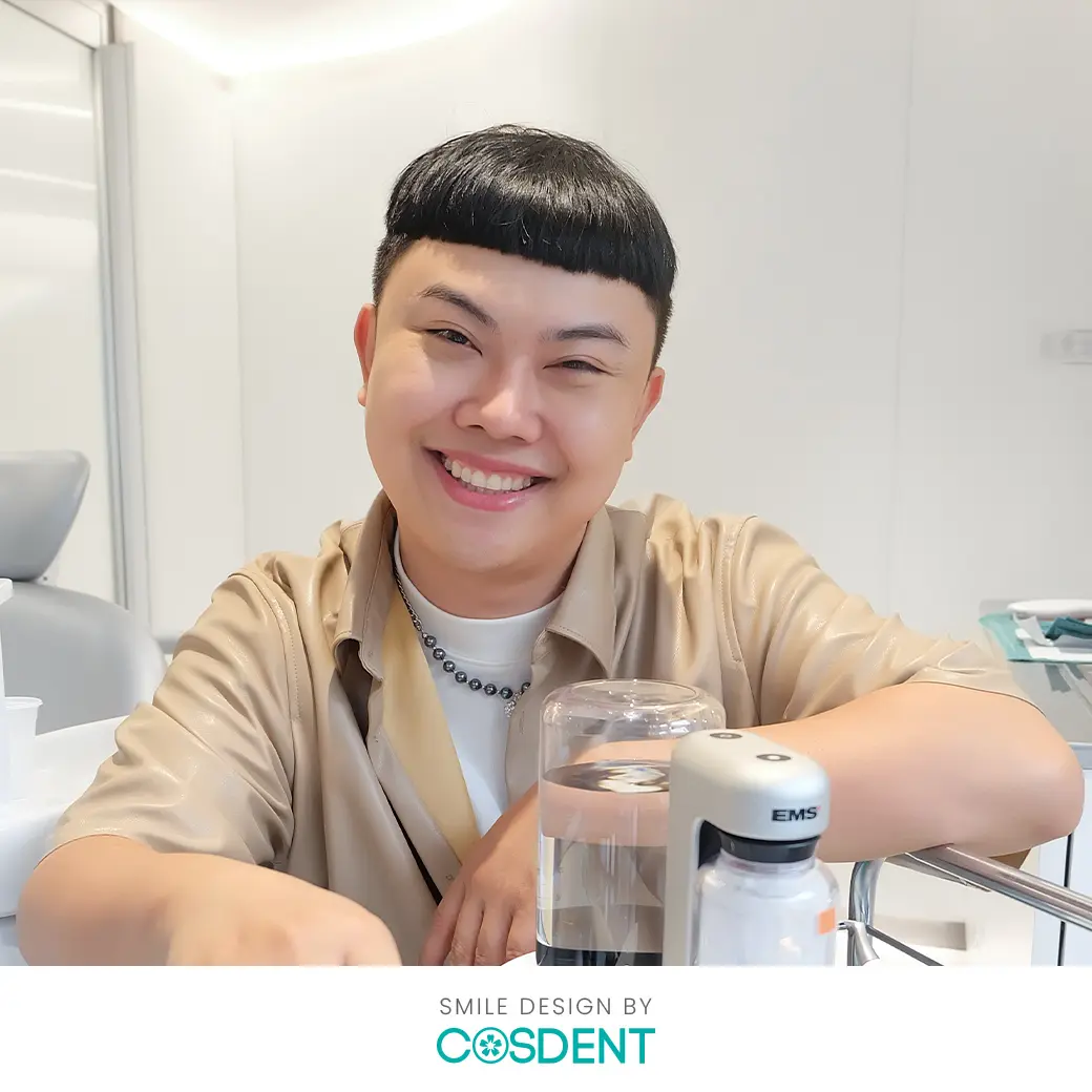 คุณเอิร์นได้เข้ารับบริการตัดเหงือกและออกแบบรอยยิ้มที่คลินิก Cosdent โดยเฉพาะกับคุณหมอฝน หลังจากตัดเหงือกแล้วได้ทำวีเนียร์เซรามิกสี 1M1 เพื่อปรับรูปร่างและสีฟัน